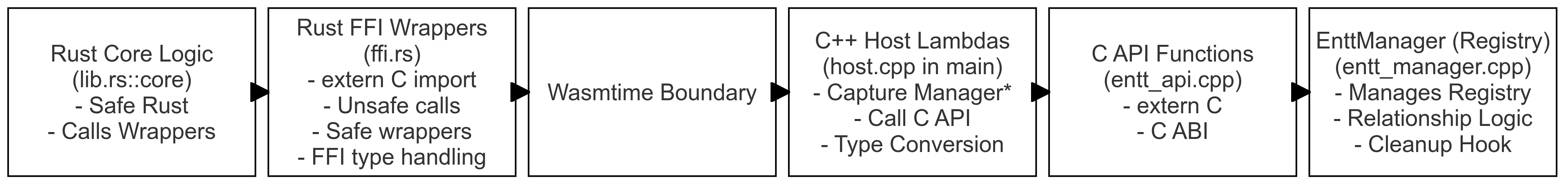 The core logic operates purely in terms of Rust types and safe function calls, interacting with the host’s EnTT world indirectly but effectively.
